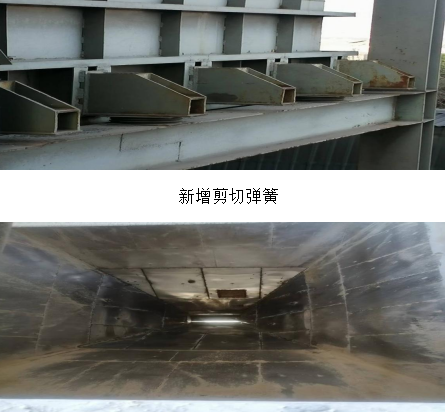 檢修班在接到任務(wù)后,立即對該問題產(chǎn)生的根源進(jìn)行梳理,對卸料應(yīng)力進(jìn)行計(jì)算和綜合分析,在確保徹底消除隱患、穩(wěn)定可靠、簡單易行和力爭最低成本的原則下研究可行性技改方案,決定采取四管齊下 :1.在每個(gè)石膏倉與框架接觸部位均布增設(shè)剪切彈簧10個(gè)(使應(yīng)力緩釋)。2.將倉內(nèi)錐段原不沾板改為不銹鋼板(滿焊)并直段噴涂鱗片樹脂(使石膏緩降,減小沖擊并消除腐蝕)。3.在真空泵出口增設(shè)減震膨脹節(jié)(隔斷設(shè)備運(yùn)行震動(dòng))。4.繼續(xù)對卸料空氣炮深挖潛能進(jìn)行技改(以致順暢下料)。