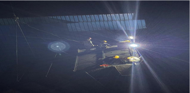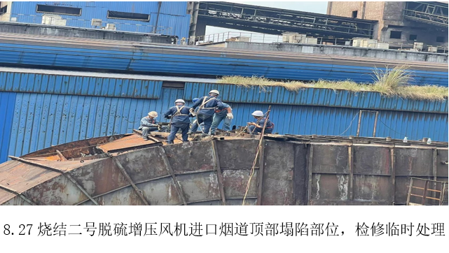 8月27日,檢修員在巡檢時發(fā)現(xiàn)并上報了燒結(jié)二號脫硫增壓風(fēng)機進口煙道頂部約27㎥鋼板出現(xiàn)塌陷,威遠(yuǎn)藍(lán)鼎生產(chǎn)部高度重視,立即將風(fēng)險隱患上報燒結(jié)廠部領(lǐng)導(dǎo),協(xié)商時間處理。當(dāng)天廠部協(xié)商停機4小時對脫落部位進行臨時加固處理。8月28日,廠部利用高溫限電停機11小時,對二號燒結(jié)進口煙道頂部脫落位置進行全面檢修。